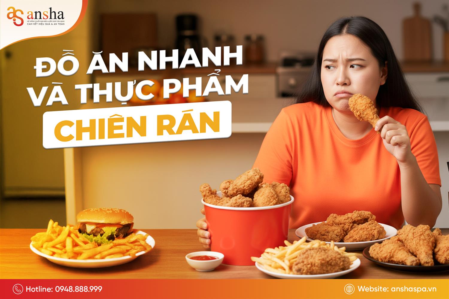 Các món chiên rán như khoai tây chiên, gà rán, nem rán hay thức ăn nhanh như hamburger, pizza, mì gói chứa hàm lượng dầu mỡ cao, giàu calo và chất béo bão hòa. Những chất này khiến cơ thể hấp thu nhiều năng lượng nhưng lại khó chuyển hóa, dễ dẫn đến tình trạng tích tụ mỡ quanh vùng bụng và nội tạng. Việc tiêu thụ thường xuyên còn gây rối loạn chuyển hóa lipid và tăng nguy cơ béo phì.